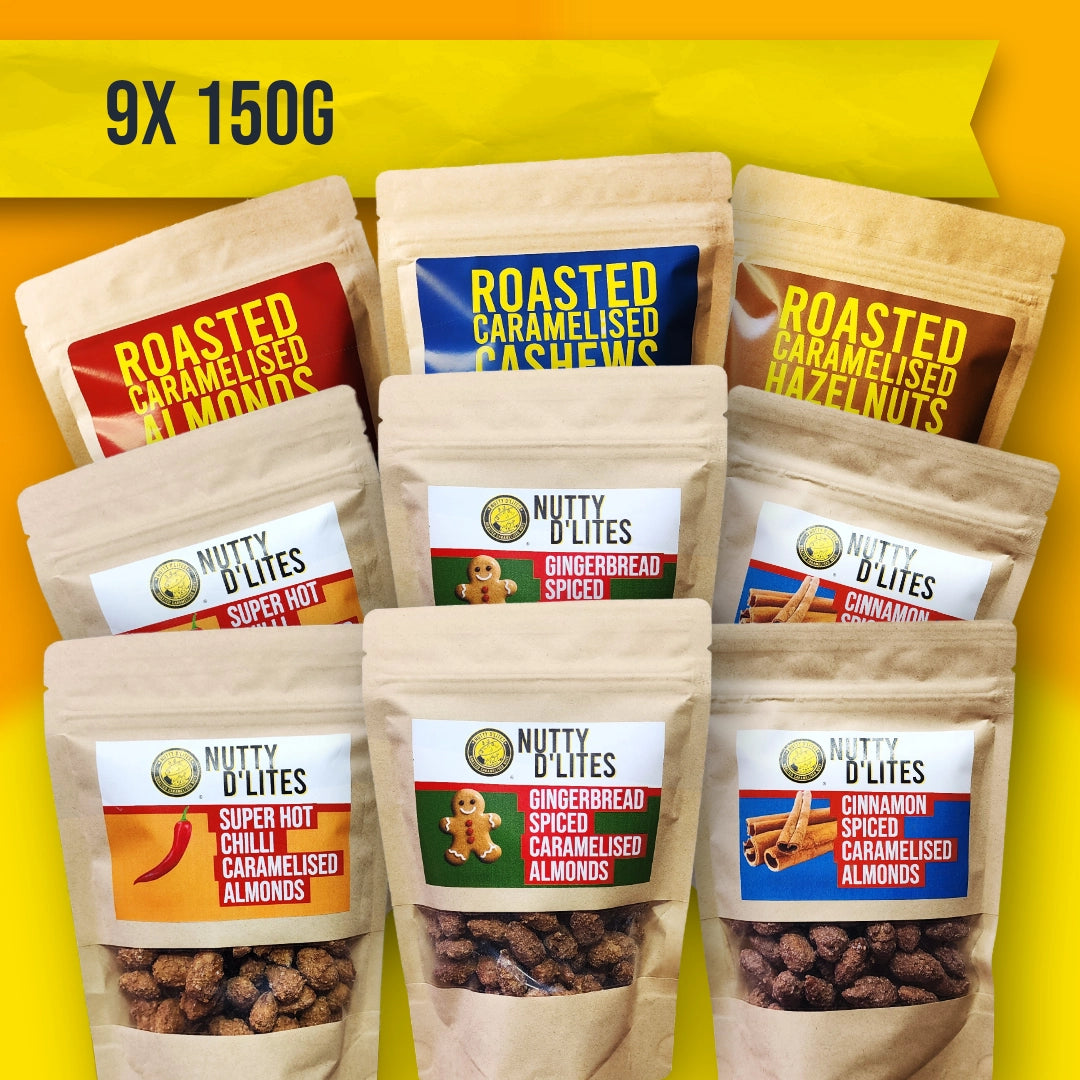 Turn up the flavour with our Ultimate Spiced Crunch Selection – a fiery, fragrant, and festive mix of handcrafted caramelised nuts. This nine-pack brings together our most adventurous creations, perfect for spice lovers and those who like their snacking with a kick: